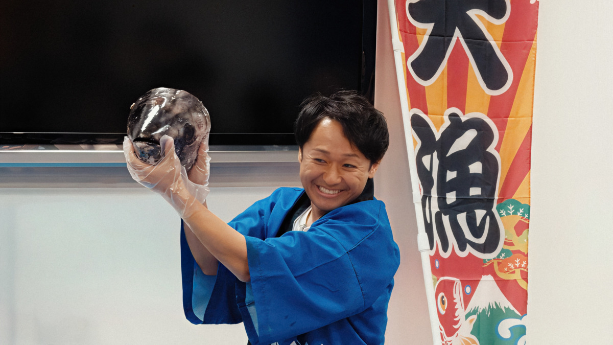 切り落としたマグロの頭を持ち上げるケンタロさんに大歓声が上がります