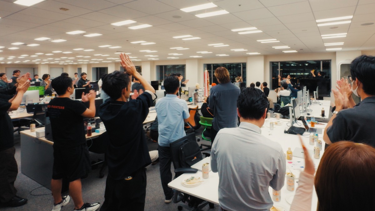 最後は参加者全員がオフィスに集結。 ロリポップ・ムームードメイン事業部 副部長より、今期を共に乗り切ったパートナーへの温かい賞賛の言葉と、来期への熱い期待を込めた力強いメッセージが送られ、一本締めで今回のペパこんはお開きとなりました。