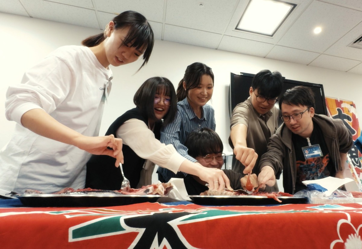 マグロの中落ち部分は今年の新卒15期生にスプーンですくい食べてもらいました。 とろけるような甘さの中落ちを頬張りながら、自然と笑顔がこぼれます。