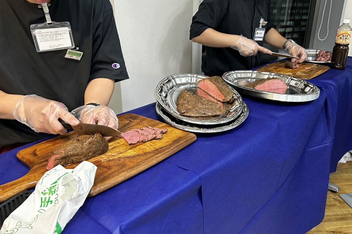 一方オフィスではローストビーフのカッティングが開始! ブロック状の牛肉を職人さんがどんどんカットします。
