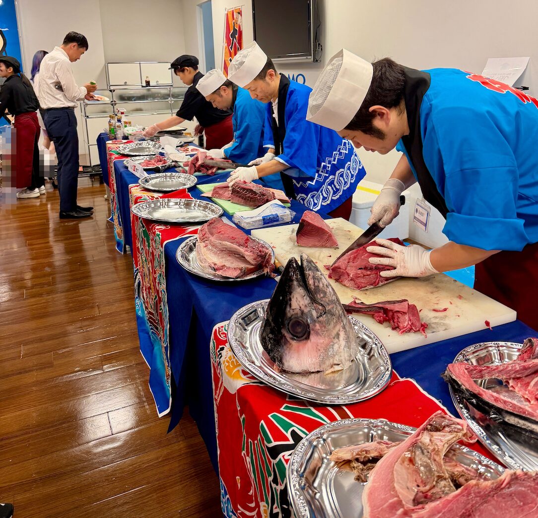 その大きさに、会場からは「でかっ!」と声がもれていました。 ケンタロさんが入刀すると、会場は歓声と拍手が上がり沸き起こり、 切り落としたマグロの頭を高く掲げる姿に、スマホを構えてシャッターの嵐!