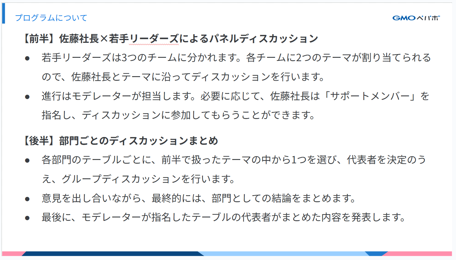 昨年は宿泊を伴う2日間で開催しましたが、今年は1日開催とし、前半では来期方針の発表、後半は社長のケンタロさんと若手リーダーズによるパネルディスカッションを実施しました。